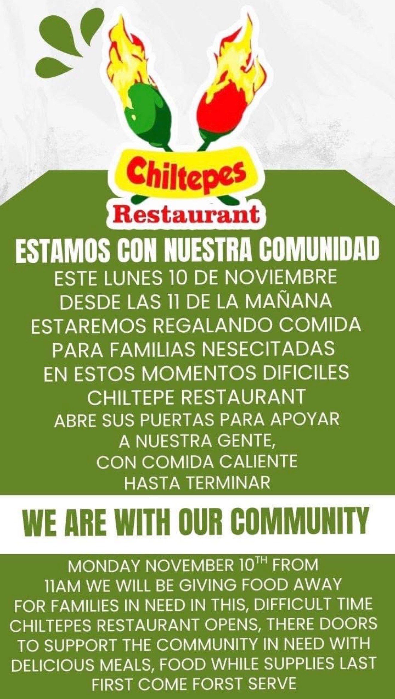Chiltepes Restaurante estará ofreciendo comida gratuita durante toda una jornada este próximo lunes 10 de noviembre a partir de las 11 de la mañana hasta que la comida se acabe.