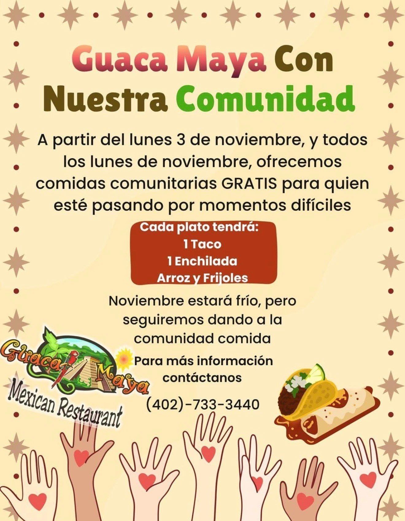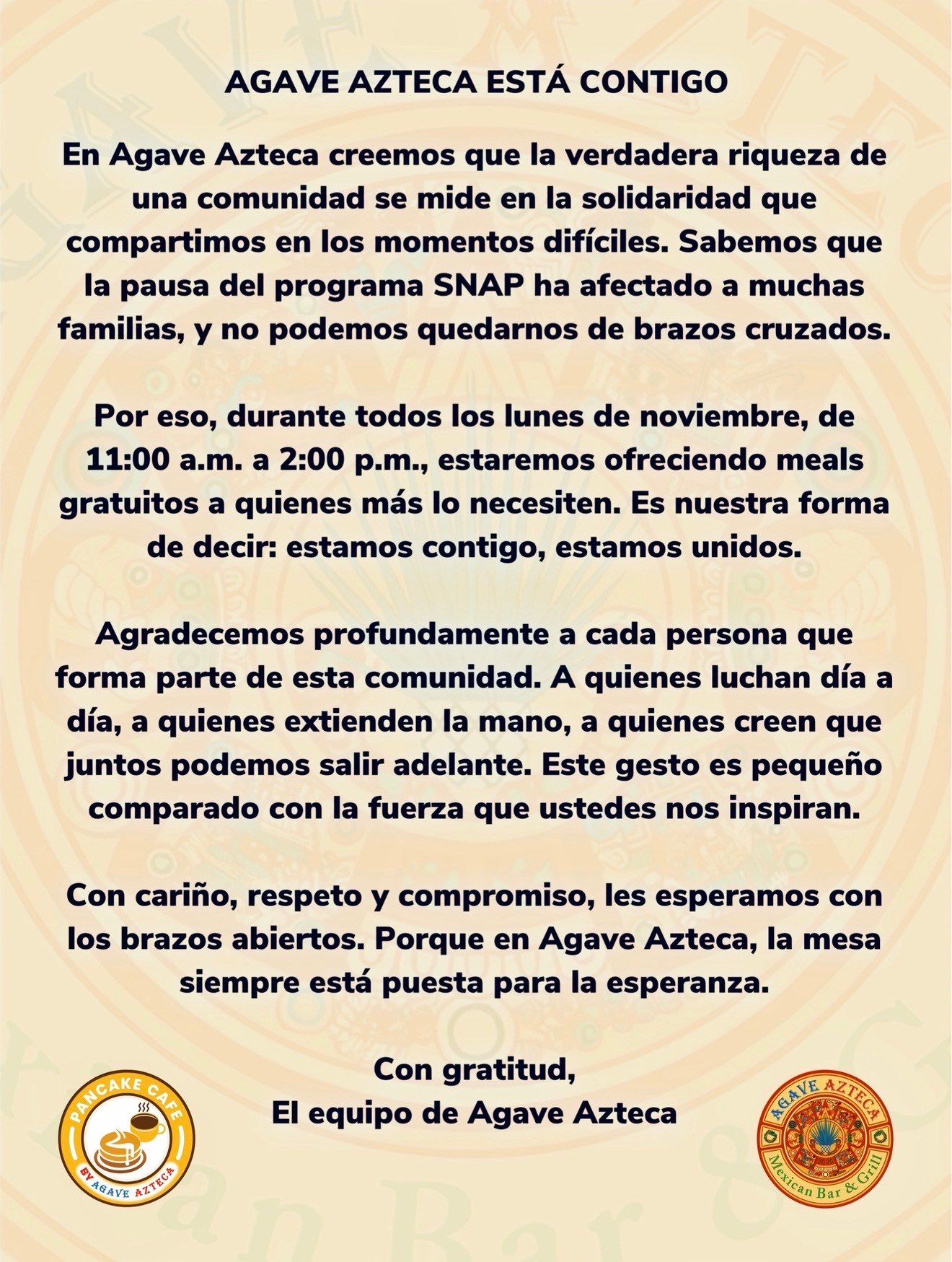 Otro restaurante que se une a esta iniciativa es Agave Azteca, ofreciendo todos los lunes del mes de noviembre de 11 de la mañana a 2 de la tarde un meal gratuito a familias de la región que enfrentan dificultades económicas derivadas de la pausa del programa SNAP.